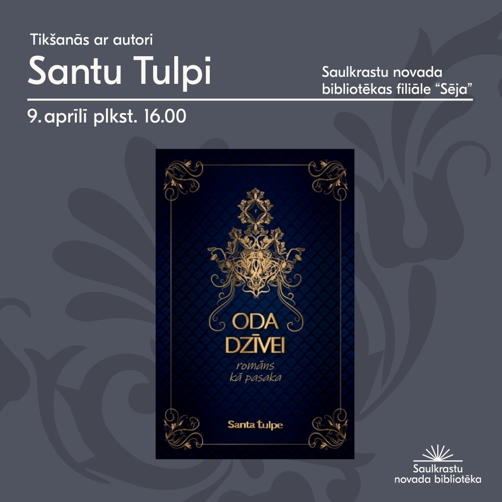 Oda dzīvei Brīnišķīga iespēja satikt autori Santu Tulpi klātienē. Gaidīsim Tevi Sējas bibliotēkā Lojā uz mājīgu sarunu pēcpusdienu.