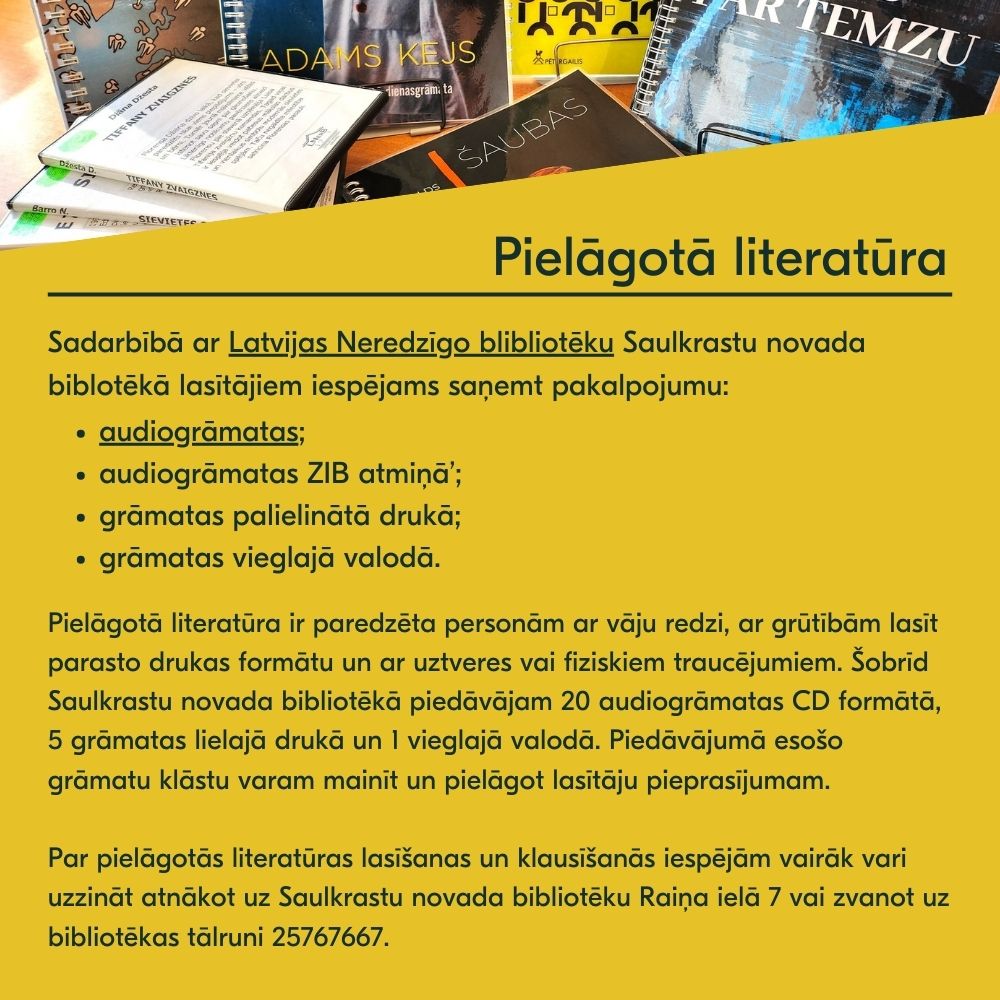 Saulkrastu novada bibliotēkā lasītājiem pieejama pielāgotā literatūra